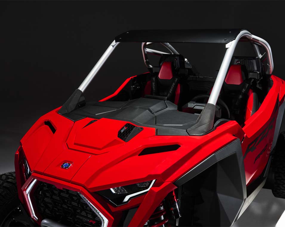 - Signature-animierte RZR Fang-Akzentbeleuchtung; weiße LED-Abblend-/Fernscheinwerfer und rote LED-Rück-/Bremsleuchten; animierte Innenraum-Akzentbeleuchtung